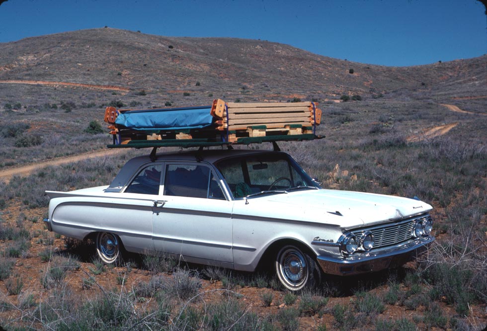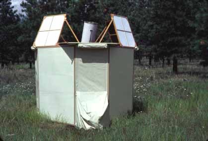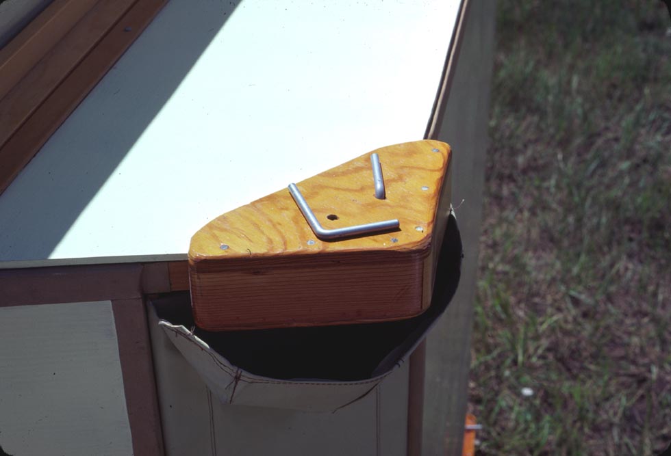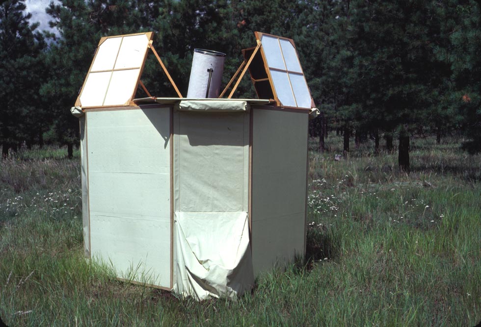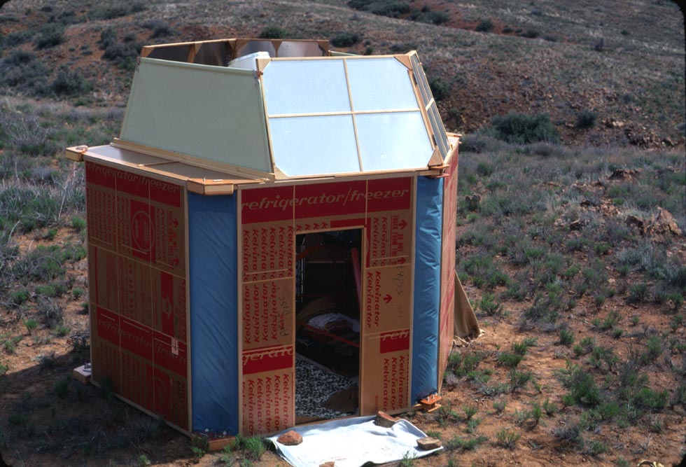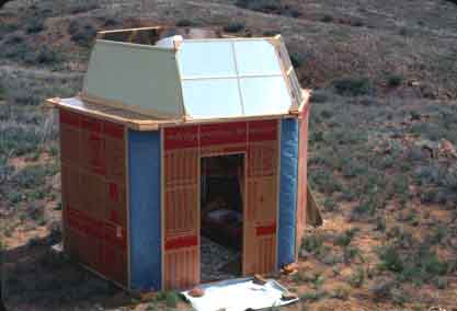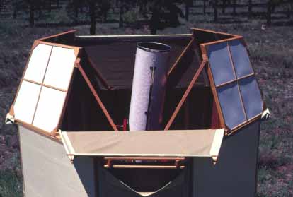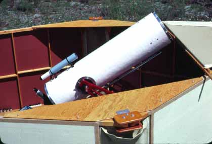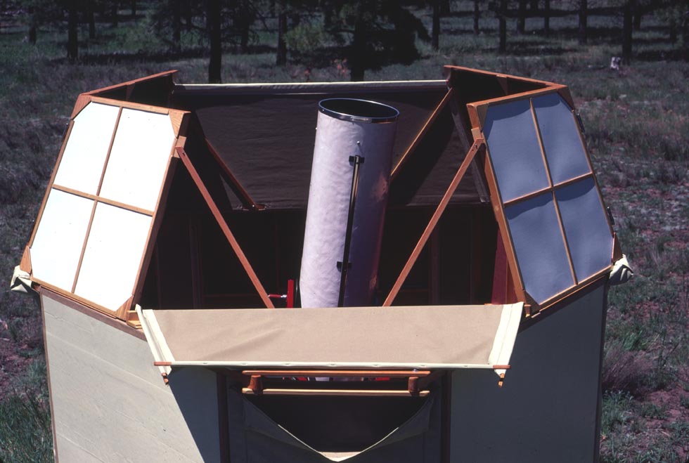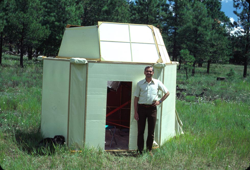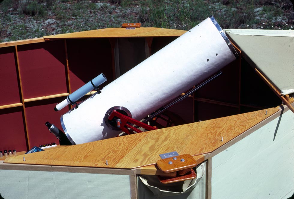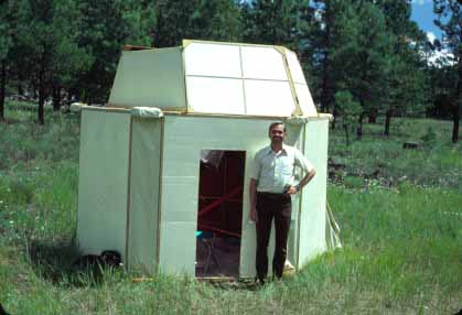 unrecognizable because of the Arizona growth.In 1977 I started and finished construction of a portable observatory for protection from the wind and cold, and to have a place to sleep during an observing trip. It has an unusual shape because it was built to accommodate my Dall-Kirkham telescope. The walls are made of double corrugated cardboard from refrigerator boxes. The four coats of paint has been adequate protection from rain. The frame is made of Douglas Fir because of its strength. The observatory has a canvas floor. Without it on my first observing trip the wind blowing between the bottom of the wall panels and the ground created a virtual dust storm inside the observatory. The two panels that face to the east are permanently hinged together. The same for the two west facing walls. Each folds as one unit and weights about 50 lbs. For a number of years the panels were transported on top a 1963 Comet. Later I used my 1974 Dodge van. Although the structure may look daunting to erect, it actually only takes about a half hour. In 1983 the portable observatory got an Honorable Mention at the Riverside Telescope Maker’s Conference. Ernie Williams, who for many years ran the audio visual part of the conference, showed up the following year at RTMC with a portable observatory he made from blue tarp material. It appeared to be the same type of material ACE Dome used years later. A few years later he improved upon his design by modifying a commercially made camping tent. I inspired Ernie with my portable observatory and Ernie may have been the inspiration for some of the canvas or tarp like portable observatories that are now available. I may have been the seed of all this. I’ll never know. |